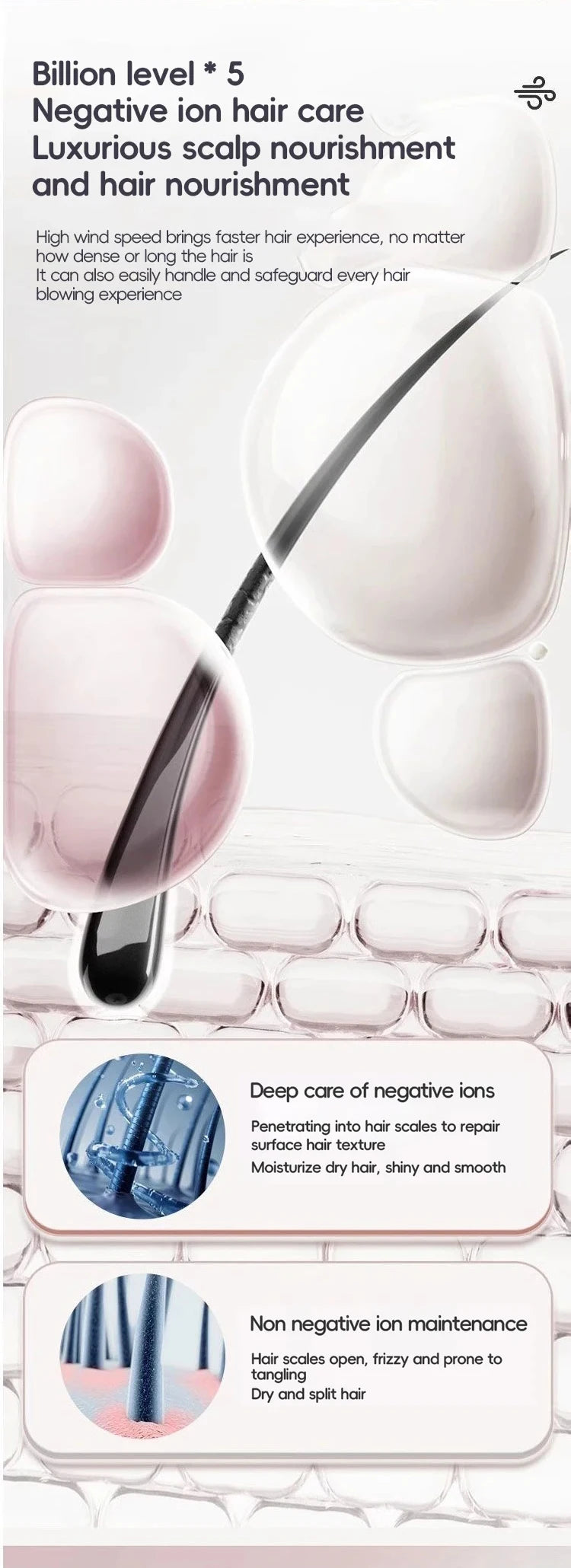 Negative ion hair dryer with high speed and no blades High power silent and quick drying Portable, suitable for home and travel